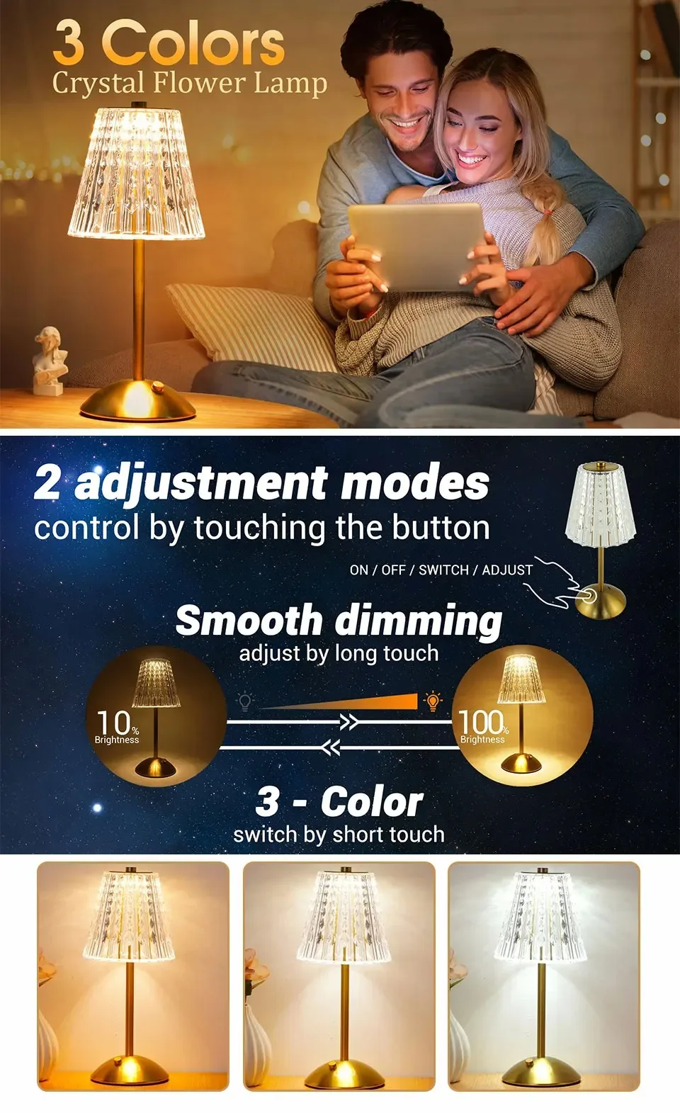 1. Dimming mode: Simply touch the lamp holder to switch colors, with three dimmable colors to choose from (warm white blend). Meet your different lighting needs. Long press the touch lamp holder to adjust the light color brightness